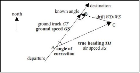 - Ground track. This side is to be drawn in the direction from takeoff to destination but with unknown speed. This still unknown speed is called the ground speed (GS).