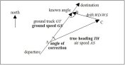 Directions are measured in degrees clockwise from geographic north, 360 degrees on the compass-card. You may measure distances and times in any unit you like. Speeds should be in unit of distance per unit of time, of course. We take the air speed as a given datum and we ignore time needed for climbing and descending. Because the plane may be drifted by the wind, the pilot must calculate which direction to head for in order to compensate the drift. For this purpose the pilot may draw a triangle whose sides are speeds: