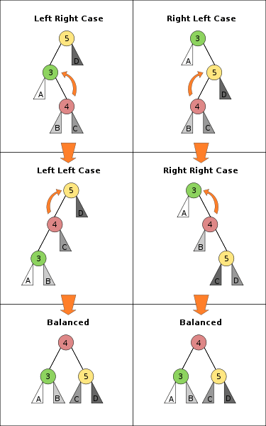 The insertion operation works by searching to the point where the new node is to be inserted, then rewriting the tree locally to insert the new point. This maintains the binary search tree property that all left children are less than the current node and all right children are greater than the current but may violate the AVL tree property that the height of the two children of a node differ by no more than 1. In that case, either one or two local rotations are performed to maintain the binary search tree property and regain the AVL tree property; the box at right, which is stolen from Wikipedia, gives the two symmetric cases. There are two special cases, where insertion occurs at the leaf of a tree, and where the key already exists in the tree; be sure to handle them properly.