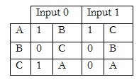 The DNA of a flib is a finite state machine like that shown above right; the sample machine has three states A, B and C, and two input/output symbols 0 and 1, and can be written in its alternate form 1B1C0C0B1A0A, which we call a chromosome. A gene is a symbol in the chromosome: A, B, C, 0, or 1. An allele is a gene at a particular locus: The allele 0 at locus 7 of chromosome 1B1C0C0B1A0A controls the flib’s output symbol when it is in state B and receives an input symbol of 1. The task performed by a flib is to recognize and predict a sequence of input/output states; for instance, the sample flib responds to the input sequence 0111000010110 with the output sequence 100001100100. By shifting the output bits one place to the right, we see only 6 of the 12 predictions are correct, a score of 50% which is no better than random chance.