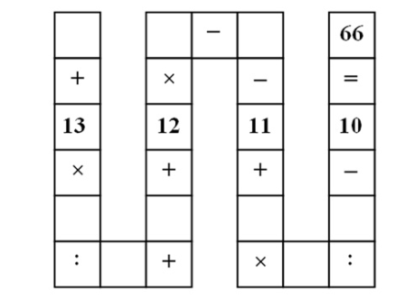 The Guardian recently published a math puzzle that is apparently given to third-grade students (eight-year old children) in Vietnam. The puzzle is a graphic in the form of a snake, and the digits 1 through 9 are to be inserted in the nine empty boxes in such a way as to make the formula correct. Although it may not be clear, the colon symbol is used for division, and the normal order of operations is to be preserved, so the formula becomes A + ((13 * B) / C) + D + (12 * E) − F − 11 + ((G * H) / I) − 10 = 66.